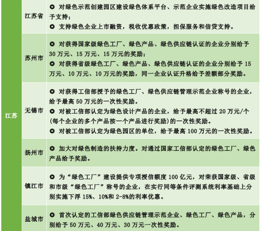 關于綠色工廠,不同的省市都有不同的鼓勵性政策補貼,下圖江蘇省的政策補貼: